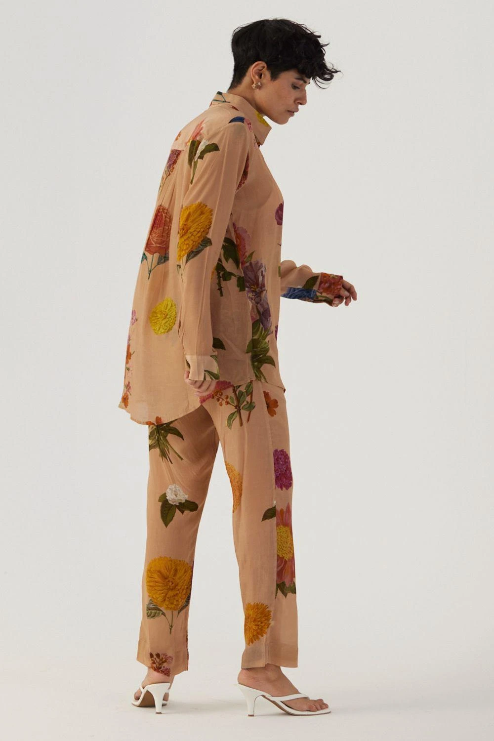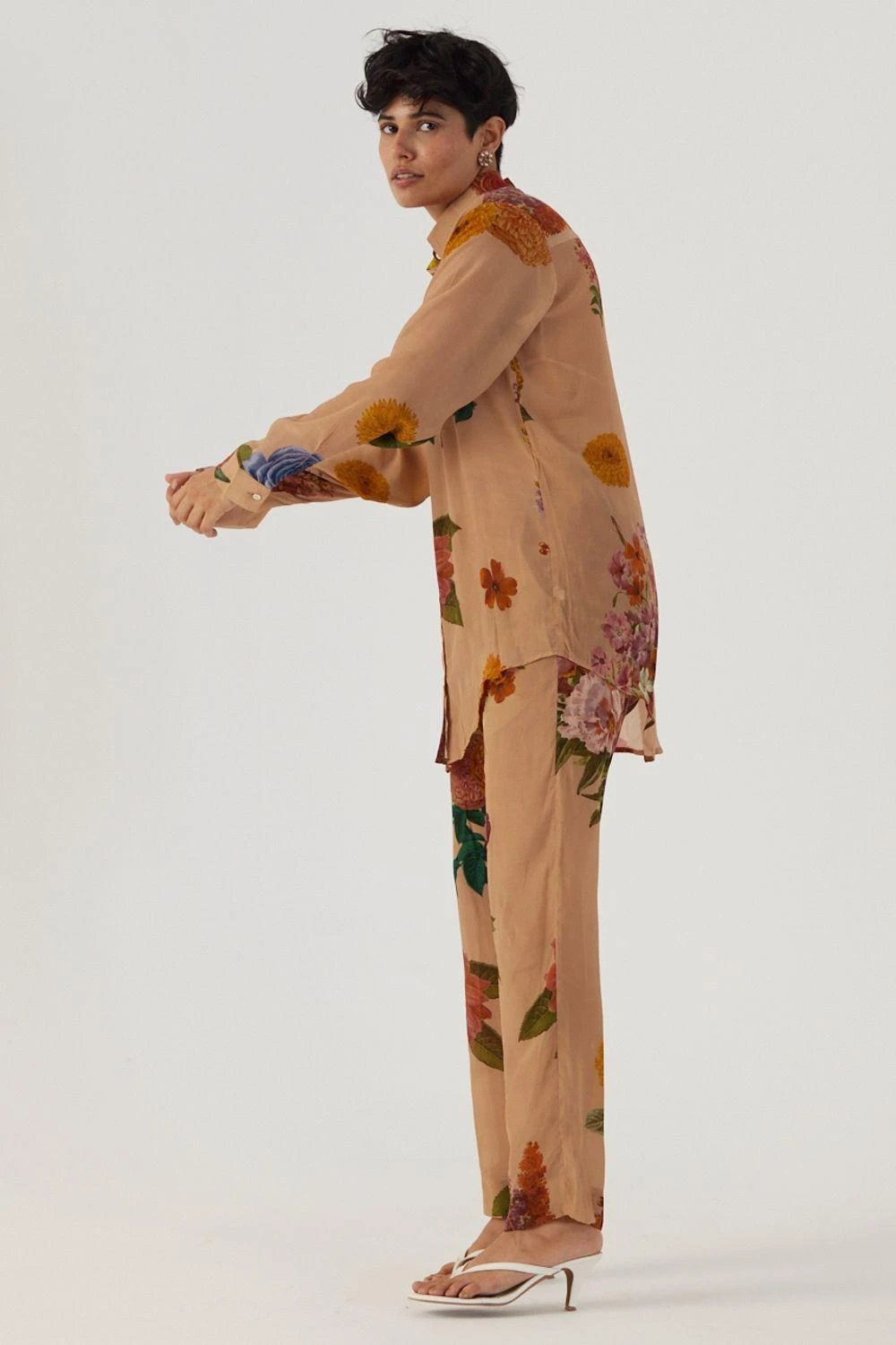 Inspired by an old botanical tapestry, the print showcases watercolour florals & leaves dancing playfully on a beige background. Embrace the touch of vintage in this set, featuring a button-down shirt with elegant back gathers & straight pants.