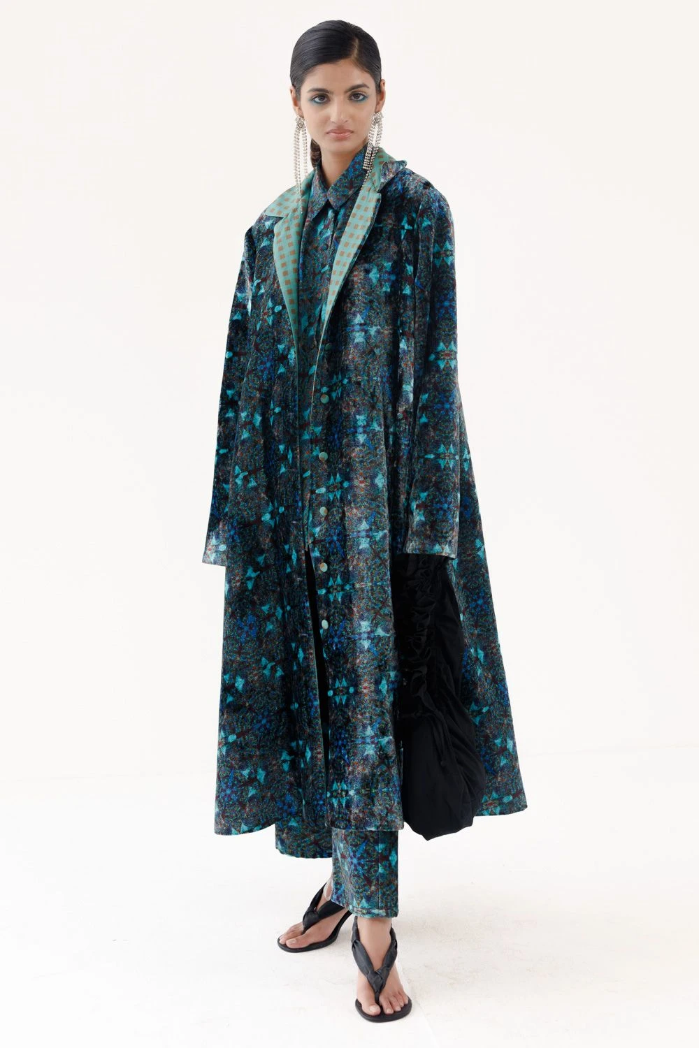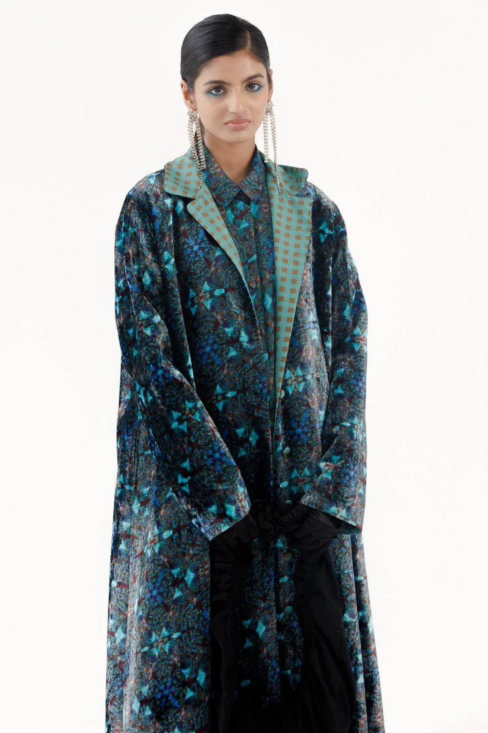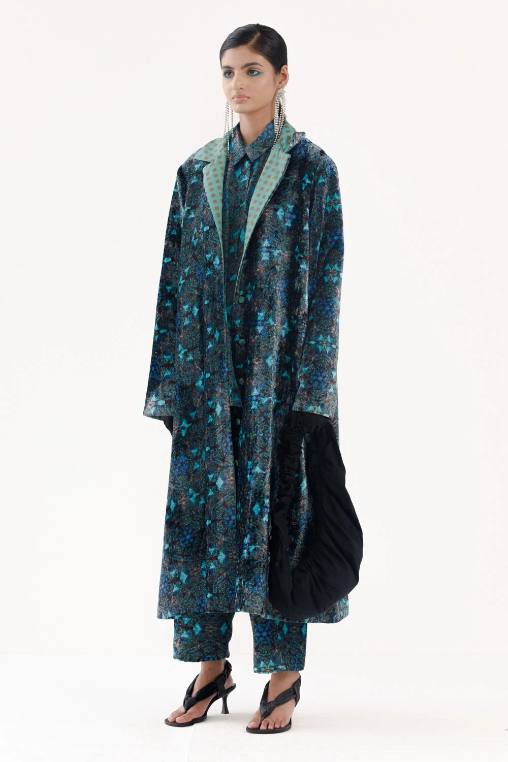 Indulge in this long silk velvet jacket, a mesmerizing kaleidoscope of electric blues and blacks. This masterpiece features a multi-check lining, checkered collar facing, and pockets, elevating your style with a fusion of elegance and artistry.