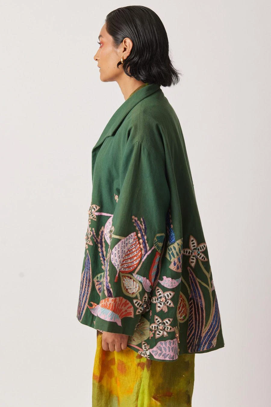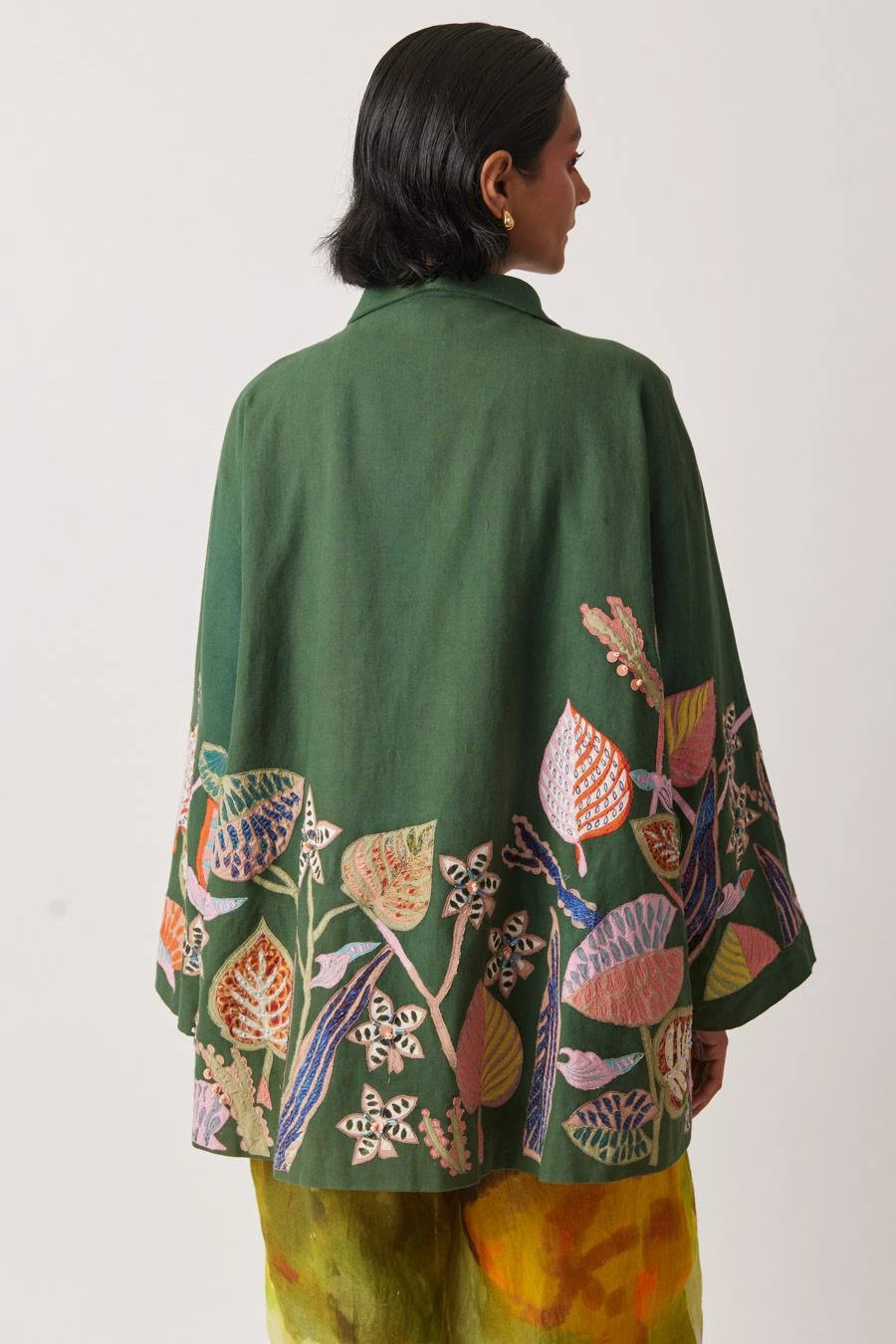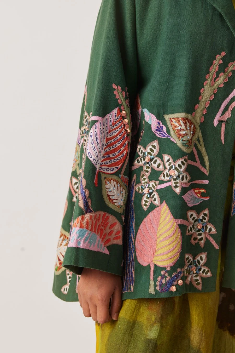 Crafted with the meticulous art of patchwork and adorned with intricate hand embroidery, this jacket showcases a botanical design, making it a one-of-a-kind statement piece that celebrates both style and eco-consciousness.