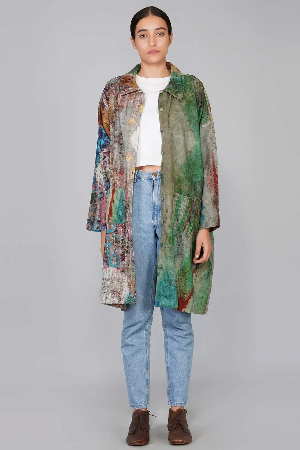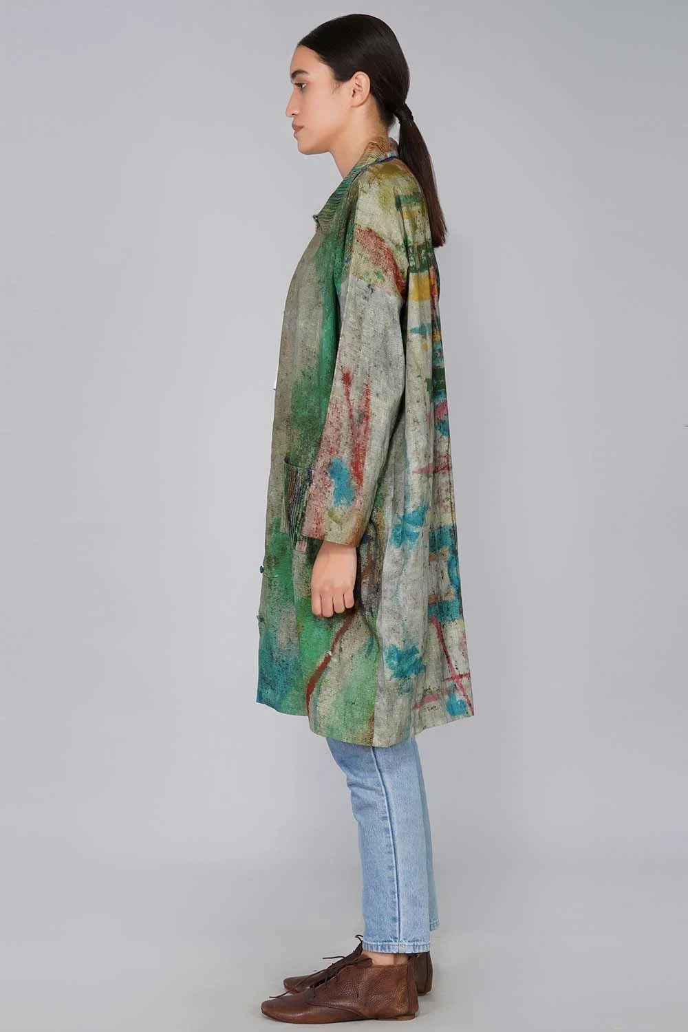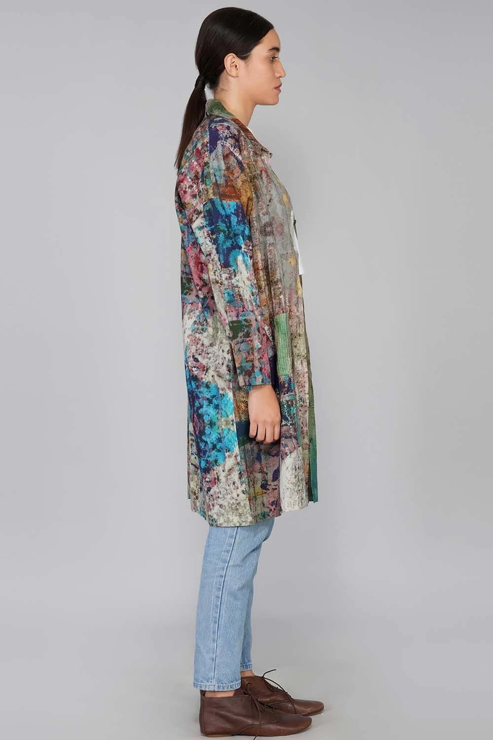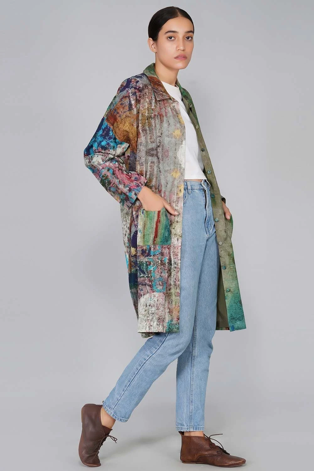 Layering is a chic and uplifting styling trick. This long flowing jacket will add artistic flair to your look. The maximal prints and the easy silhouette strikes the optimum balance. You can wear it as a jacket or style it solo as a dress.