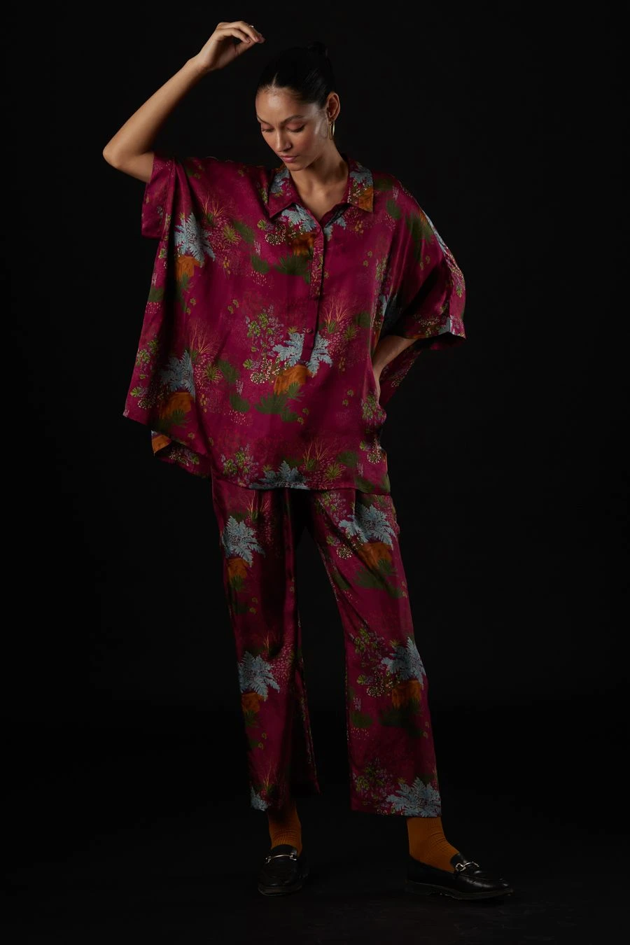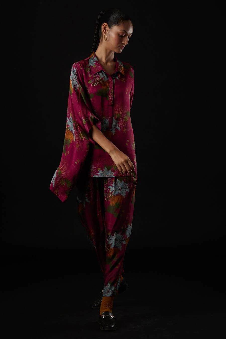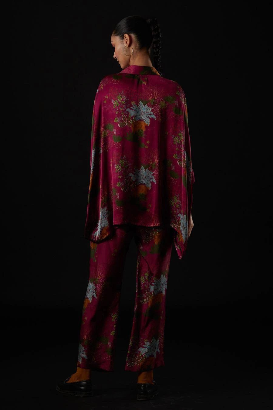 This vineyard top falls in the realm of luxe minimalism. An assortment of bold and contrasting strokes circumscribe the deep olive, on Yavis classic shirt with a mandarin collar, long sleeves, and handmade fabric buttons.