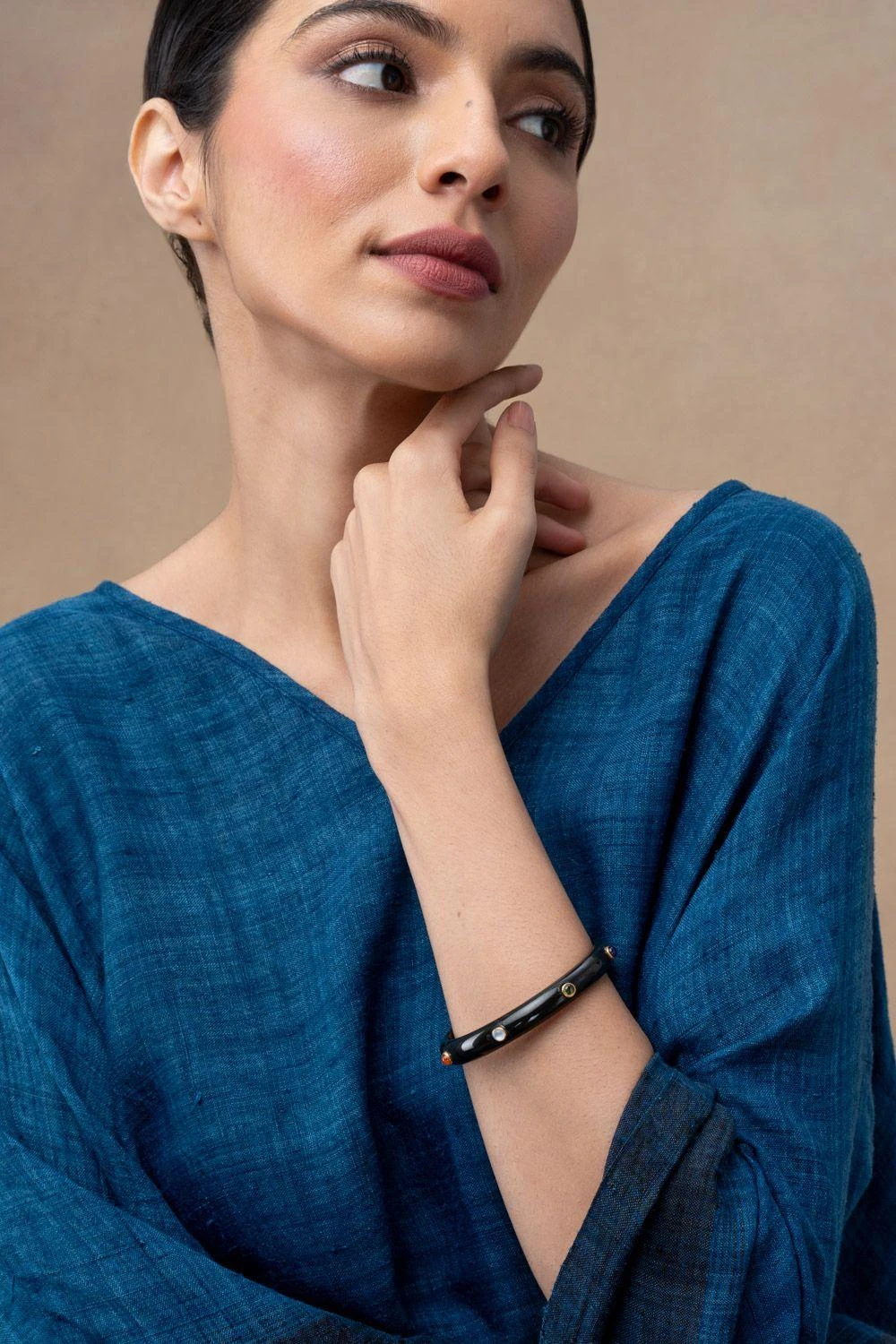 Indulge in the timeless allure of this Jahan hand-carved bangle. Each intricate detail tells a story of artistry and craftsmanship, adorning your wrist with elegance and grace.