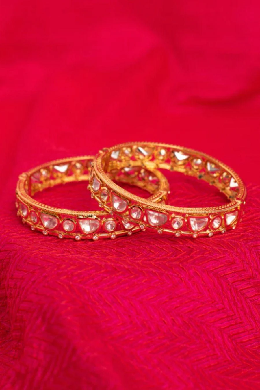 Accentuate your festive looks with these bangles. Crafted in gold plated brass, these kada’s with rhodium finish are studded with polki kundan stones.